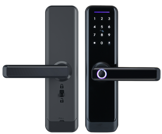 fingerprint+ card+ key ●Material: Tempered glass+S.S 304 ●Mortise: 4585 ●Power: alkaline battery ●Color: Black
